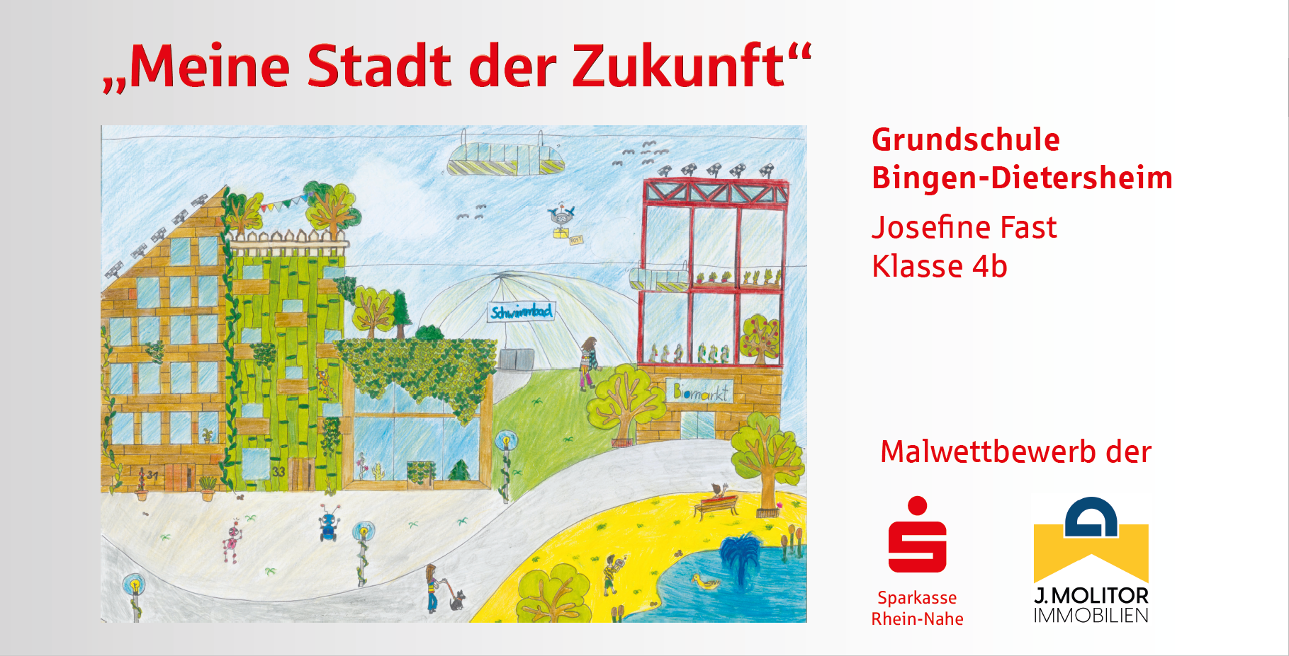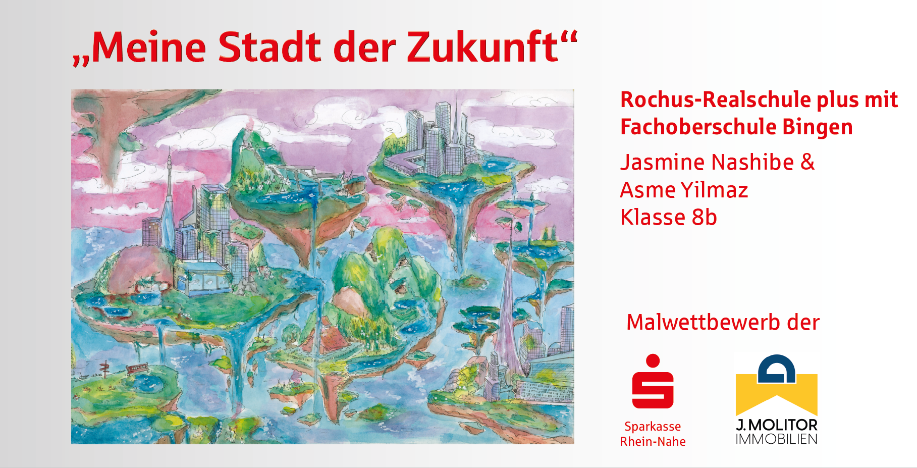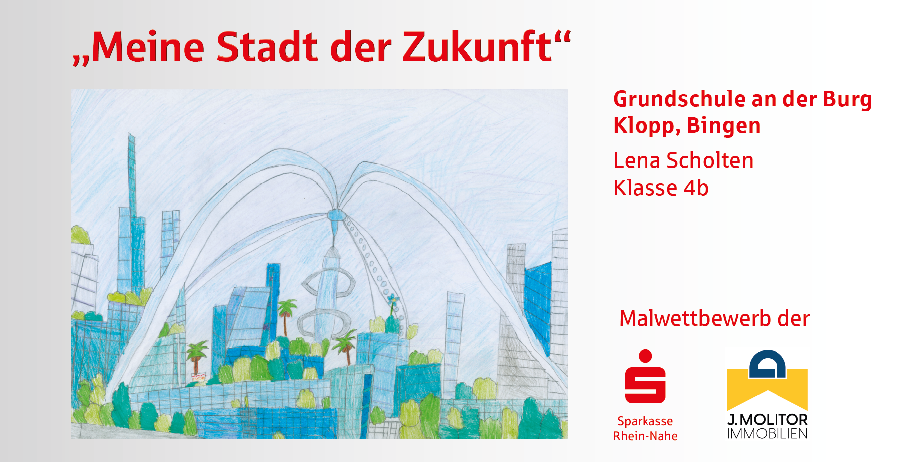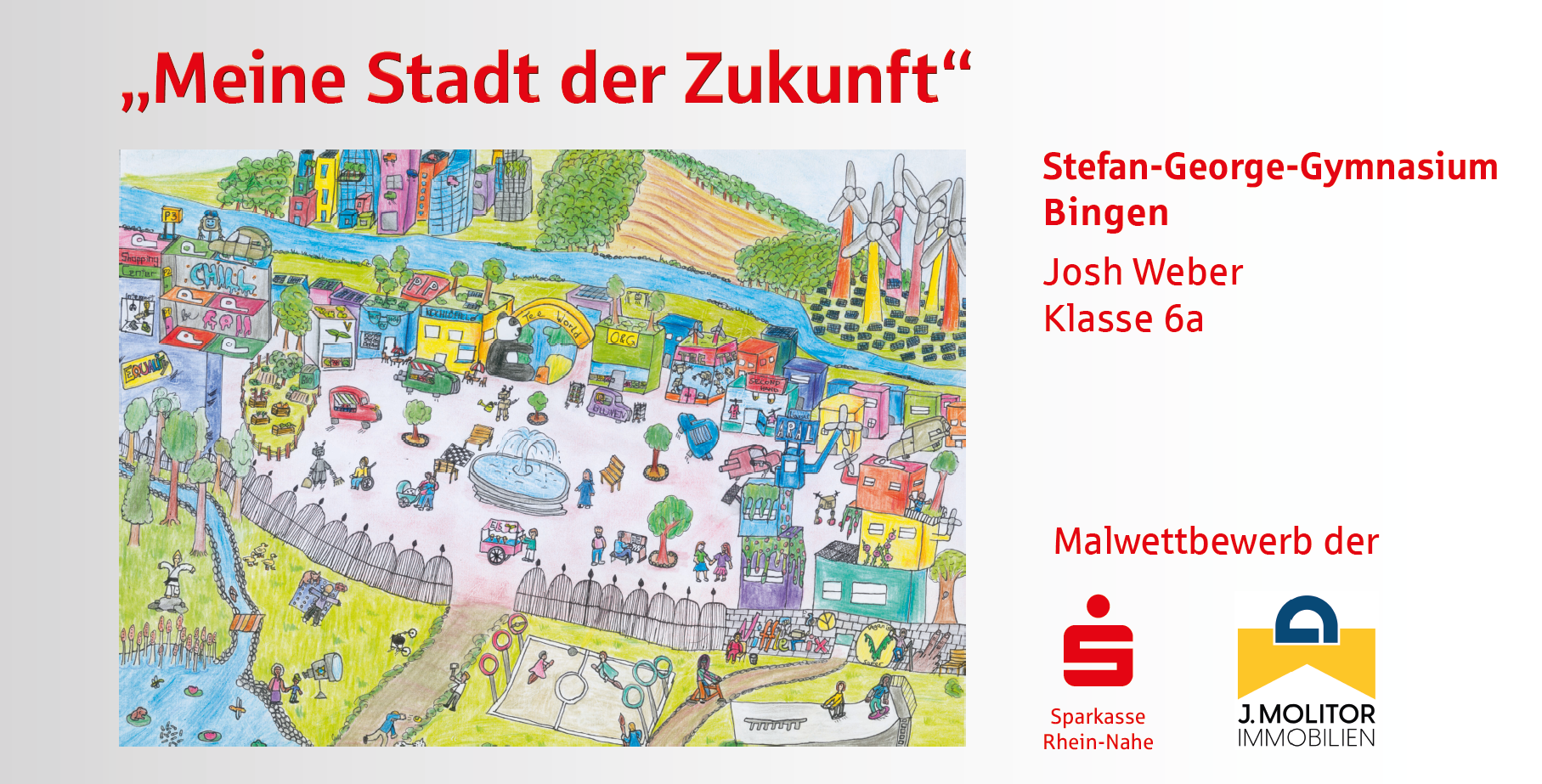 Die Sparkasse Rhein-Nahe und die J. Molitor Immobilien GmbH haben unter der Schirmherrschaft des Oberbürgermeisters von Bingen, Thomas Feser, zu einem Malwettbewerb in den Binger Grund- und weiterführenden Schulen aufgerufen und fast alle Schulen haben sich beteiligt. In den letzten zwei Monaten haben sich Schülerinnen und Schüler aus 9 Binger Schulen zum Motto „Meine Stadt der Zukunft“ Gedanken gemacht und diese kreativ zu Papier gebracht. Heraus gekommen sind neun ganz wunderbare Arbeiten, die, gedruckt auf Bauzaun-Banner, offiziell präsentiert wurden.