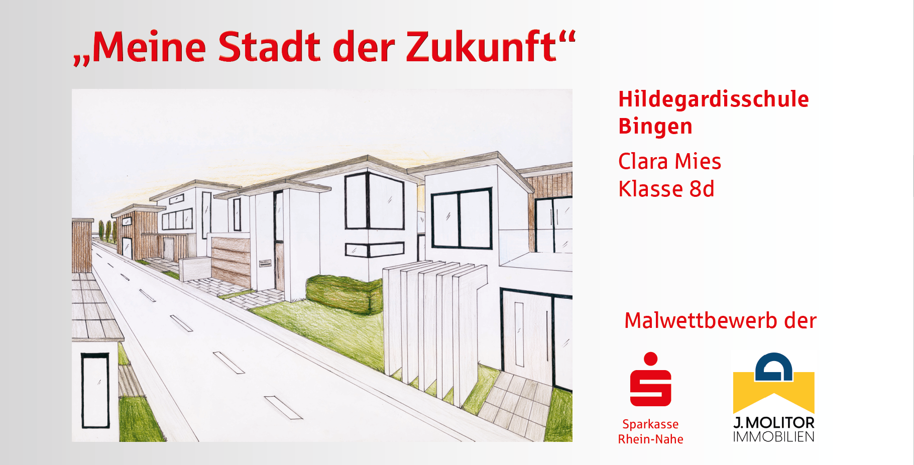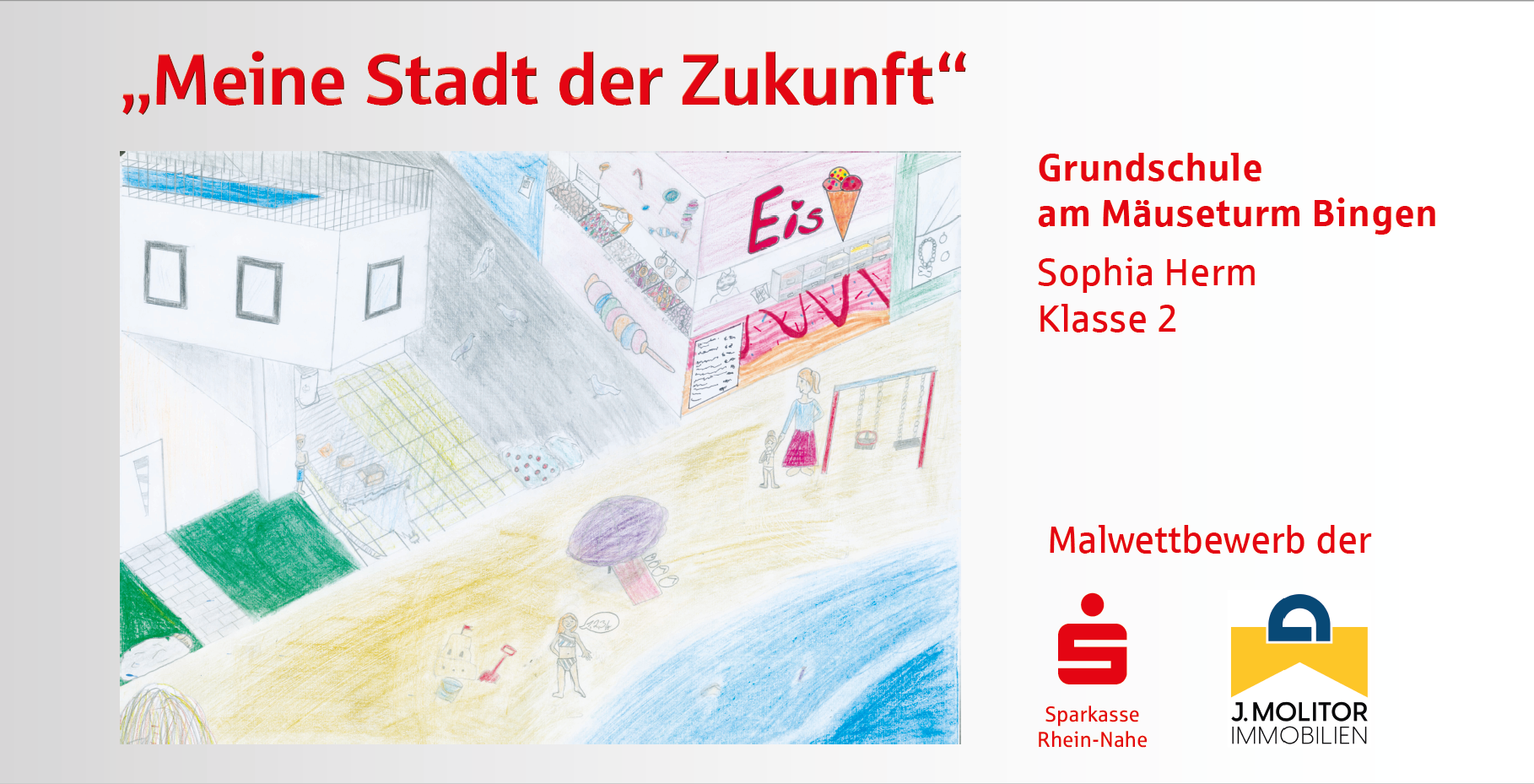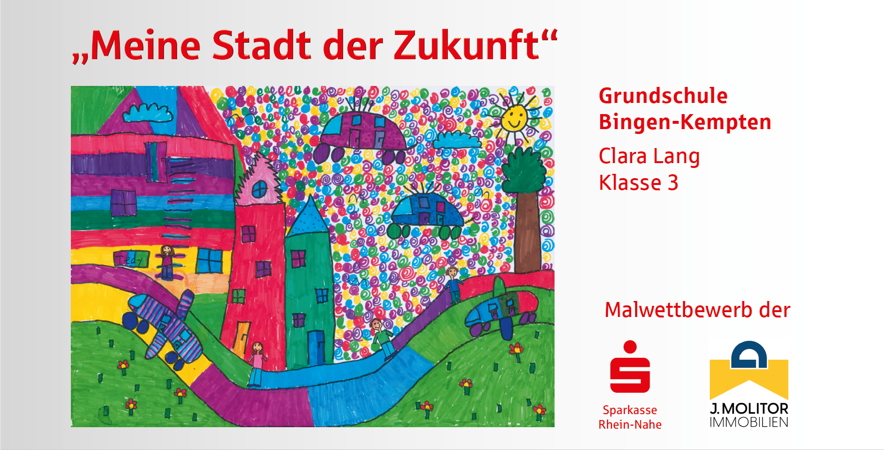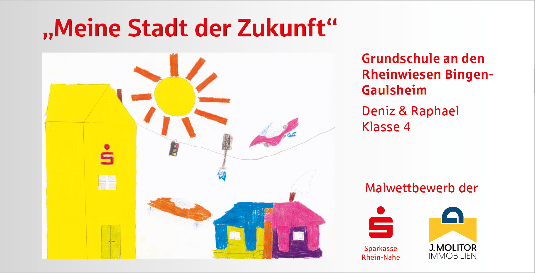 Die Sparkasse Rhein-Nahe und die J. Molitor Immobilien GmbH haben unter der Schirmherrschaft des Oberbürgermeisters von Bingen, Thomas Feser, zu einem Malwettbewerb in den Binger Grund- und weiterführenden Schulen aufgerufen und fast alle Schulen haben sich beteiligt. In den letzten zwei Monaten haben sich Schülerinnen und Schüler aus 9 Binger Schulen zum Motto „Meine Stadt der Zukunft“ Gedanken gemacht und diese kreativ zu Papier gebracht. Heraus gekommen sind neun ganz wunderbare Arbeiten, die, gedruckt auf Bauzaun-Banner, offiziell präsentiert wurden.