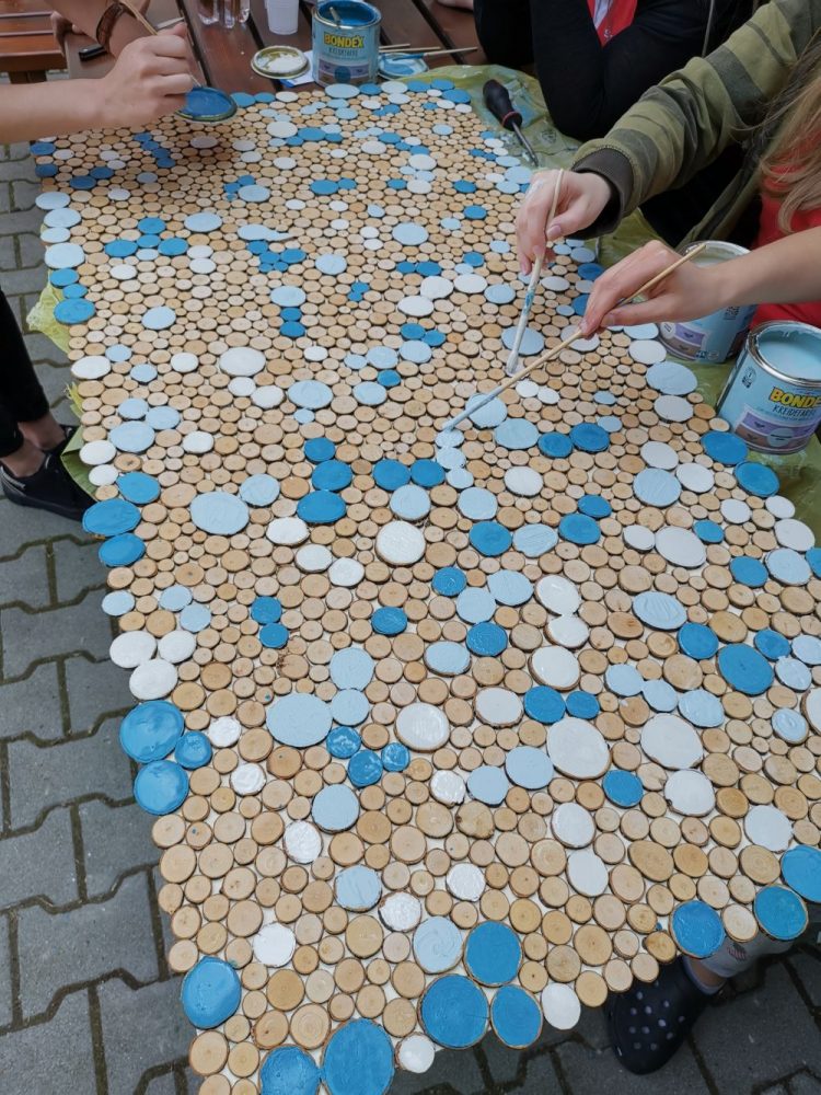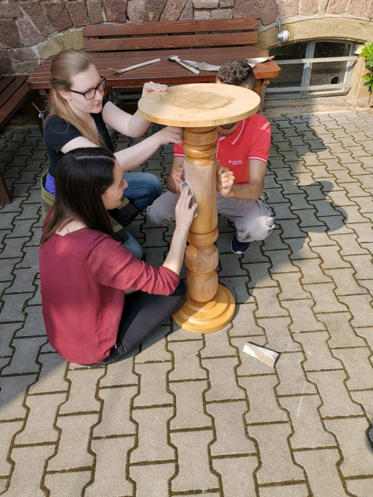 Die Dekobeauftragten haben einen alten Holztisch aufpoliert und eine Dekowand gebastelt: