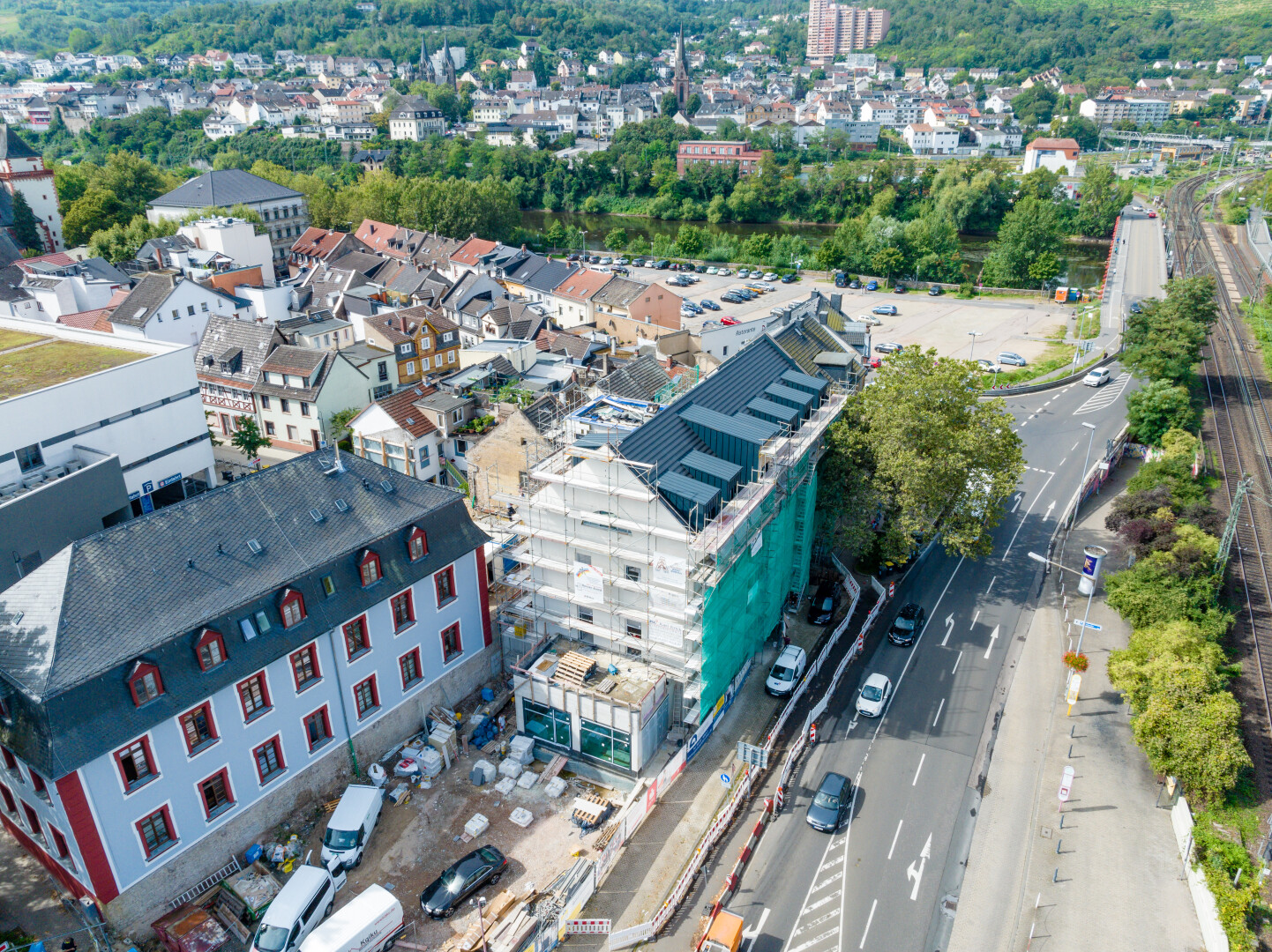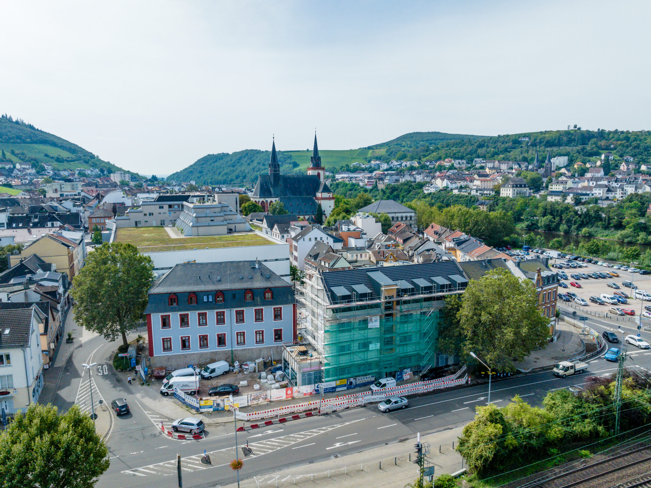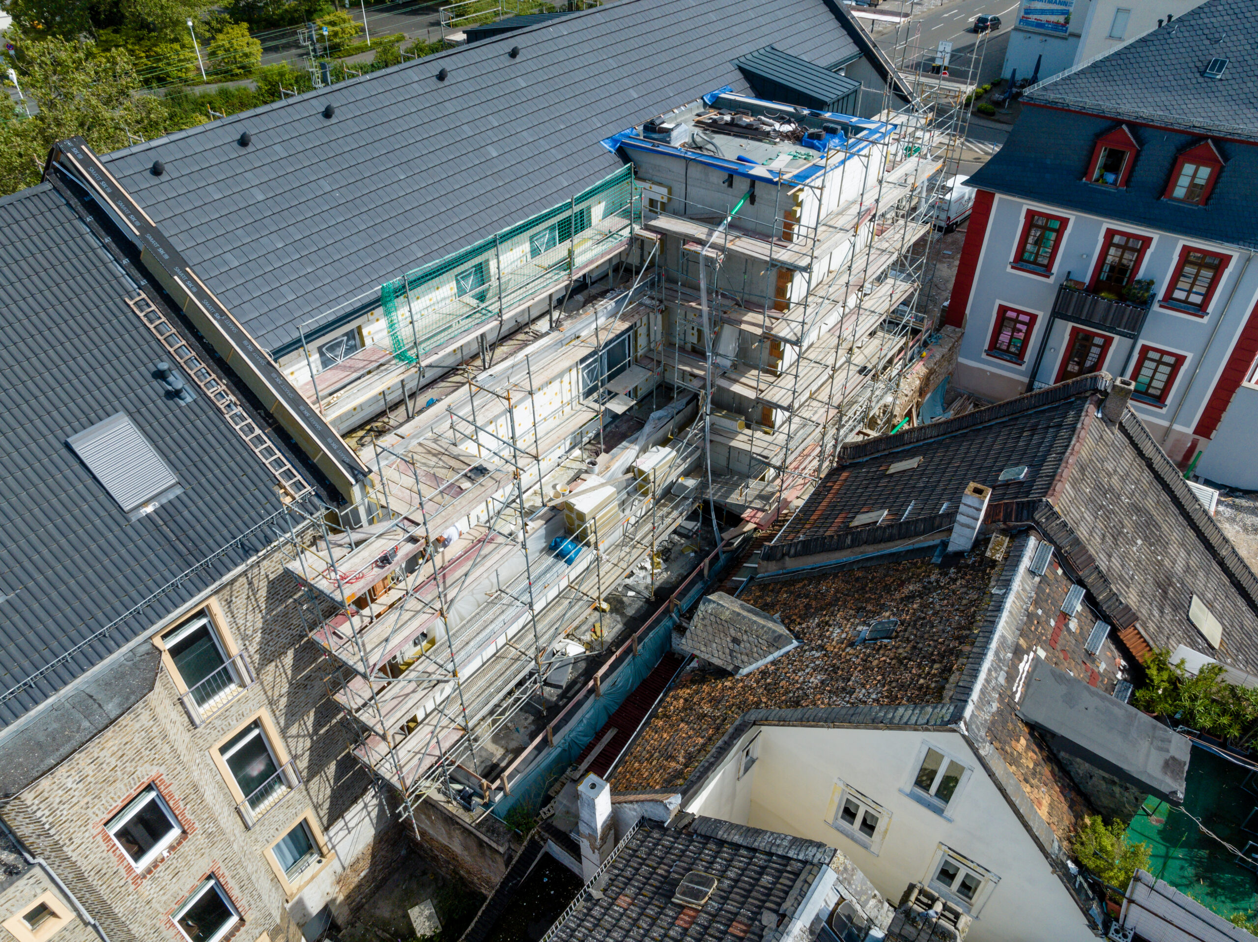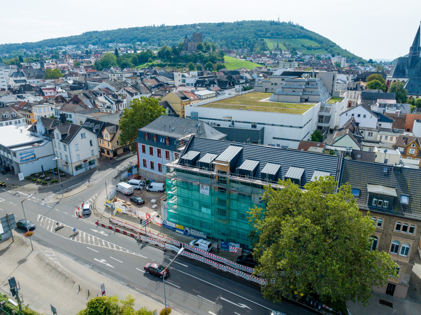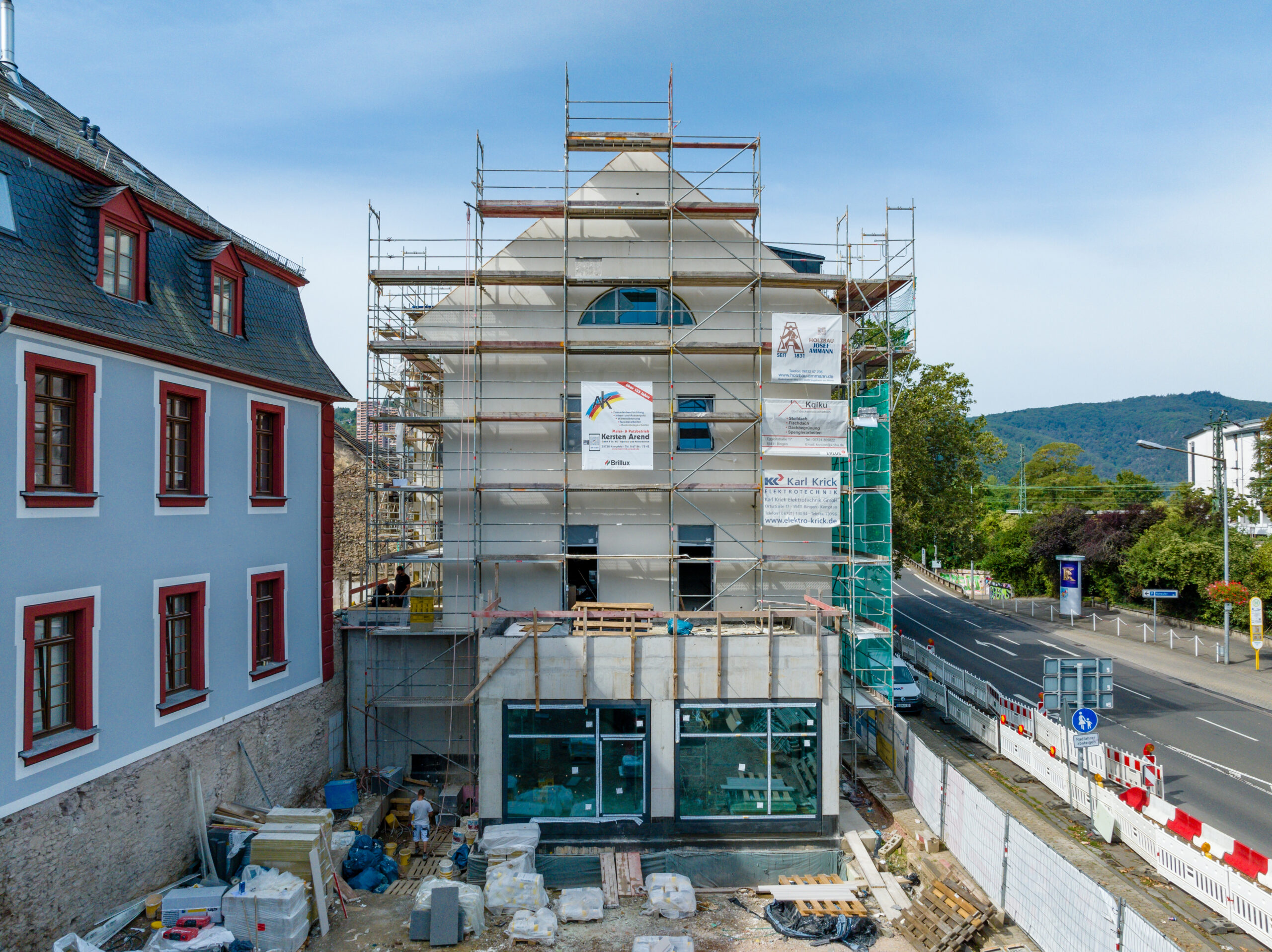 Der Baubeginn war geprägt vom sorgfältigen Rückbau der ehemaligen Tankstelle und der Reinigung des Erdreichs von Schadstoffen. Mittlerweile ist der Rohbau abgeschlossen und der Ausbau ist im vollen Gange. Das Gerüst ist bereits abgebaut, die Fassade deutlich erkennbar und im unteren Bereich wird der Naturstein angebracht.
