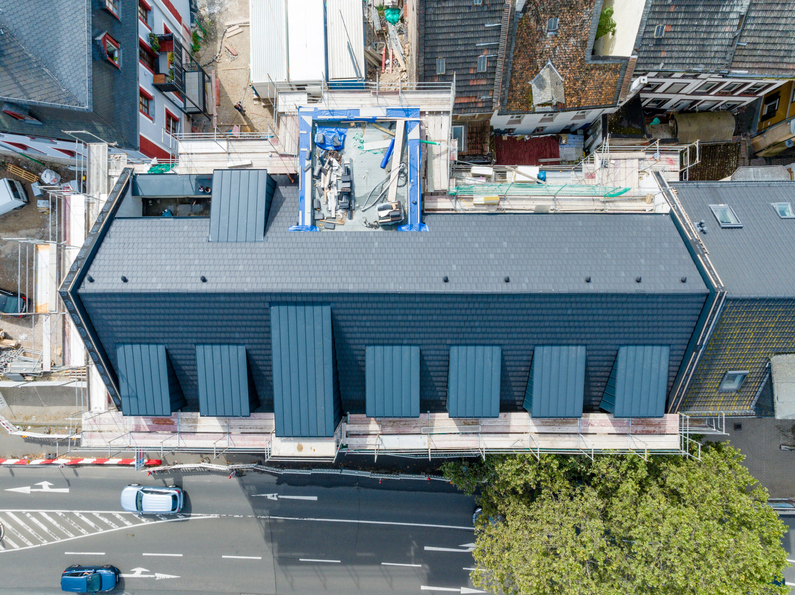 Der gesamte Neubau wurde orientiert an den Prinzipien der Gebäudezertifizierung der Deutschen Gesellschaft für nachhaltiges Bauen (DGNB) mit einem klaren Fokus auf „schadstoffarmes Bauen“, gestaltet. Wir legen großen Wert darauf, ausschließlich schadstofffreie Materialien zu verwenden, um potenzielle Gesundheitsrisiken zu minimieren. Ein konkretes Beispiel hierfür ist die Entscheidung, den Erker und die Dachentwässerung mit Aluminium anstelle von Zink zu verkleiden. Dadurch vermeiden wir Schadstoffemissionen in die Umwelt und setzen auf eine nachhaltigere Bauweise.